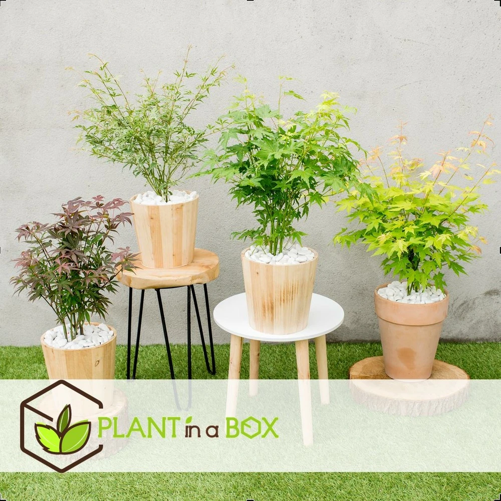 Les erables du japon sont réputés pour leurs feuilles aux couleurs chatoyantes. Chaque arbre a une couleur et un feuillage qui lui est propre. Ce set se compose de 4 variétés différentes d’erables du japon. Toutes sont résistantes au froid et enchanteront votre jardin. Mettez- les en terre ou en pot. Vous pouvez également les tailler pour en faire de magnifiques bonsaïs. Le set est composé de 4 plantes: erable du japon ´orange dream´, erable du japon ´atropurpureum´ , erable du japon ´butterfly´, erable du japon ‘going green’. L’acer palmatum ‘orange dream’ est un erable du japon avec de magnifiques feuilles jaune-orangé. Il se démarque des autres variétés car il prend plus de hauteur. L’acer palmatum ‘atropurpuream’ est un erable du japon qui embellira chaque jardin. Il se porte également très bien en pot sur votre terrasse ou balcon. Son feuillage finement ciselé de couleur rouge foncé vous émerveillera en automne par sa teinte rouge bordeaux. L’acer palmatum ‘butterfly’ est un erable du japon qui embellira chaque jardin. Il se porte également très bien en pot sur votre terrasse ou balcon. Poussant lentement il forme un arbuste ramifié au feuillage rose, blanc et vert. Il supporte aussi bien le soleil que les emplacements plus ombragés. L’acer palmatum ‘going green’ est un erable du japon aux feuilles vertes qui se teinteront de jaune-orangé à l’automne. Son branchage vert apportera de la couleur à votre jardin pendant les mois d’hiver. Il est préférable de ne pas l’exposer en plein soleil. Les erables du japon se plantent entre le mois de mars et début octobre. Le sol étant chaud l’arbuste pourra installer ses racines. Installez votre acer dans un endroit ombragé. L’excès de soleil assècherait les racines et risquerait de roussir les feuilles. Les erables perdent leurs feuilles en hiver mais ils sont résistants au froid et le nouveau feuillage apparaîtra dès le mois de mars. Chaque plante mesure à la livraison entre 25 et 40 cm (la hauteur du pot est incluse dans la mesure). Le pot de transport a un diamètre de 10cm