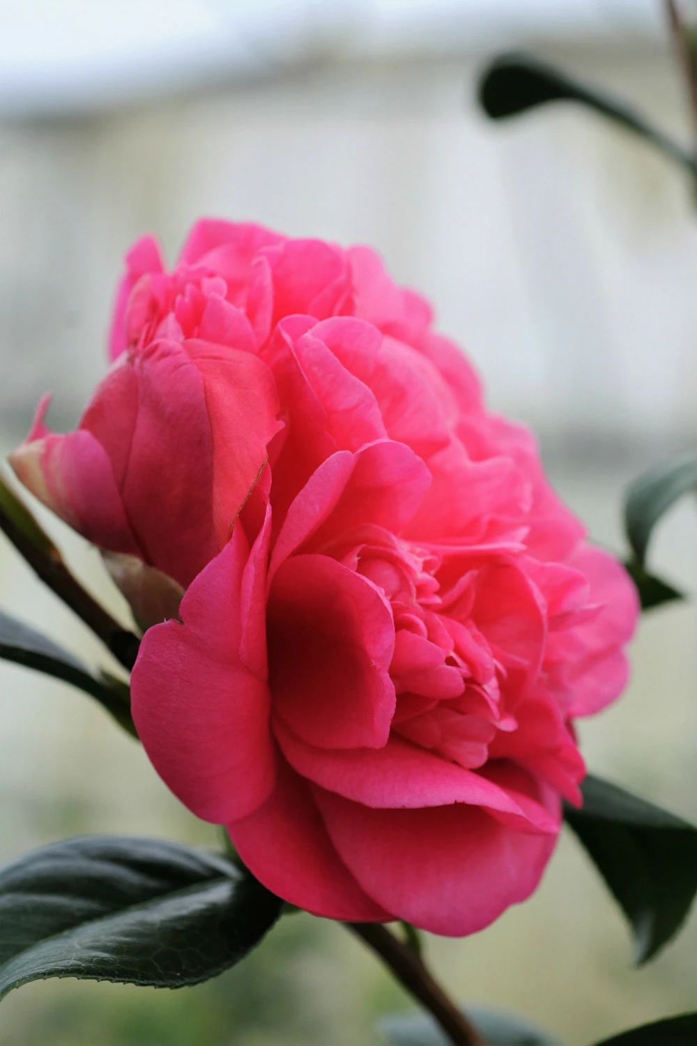 (c. Saluenensis x c. Japonica) végétation compacte et érigée, feuillage sombre, floraison généreuse. Sa grande fleur ressemble à une pivoine d’un rose vif carminé. Il se comporte bien en haie et en pot.