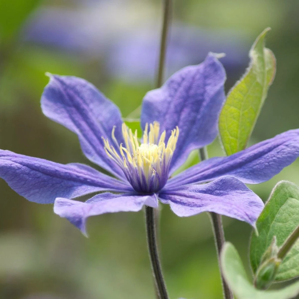 fleurs bleues à étamines de couleur crème. C’est une variété robuste. Cette clématite pourra servir de couvre sol si vous ne lui apportez pas de support. Elle peut également être utilisée sur une terrasse en potée fleurie.