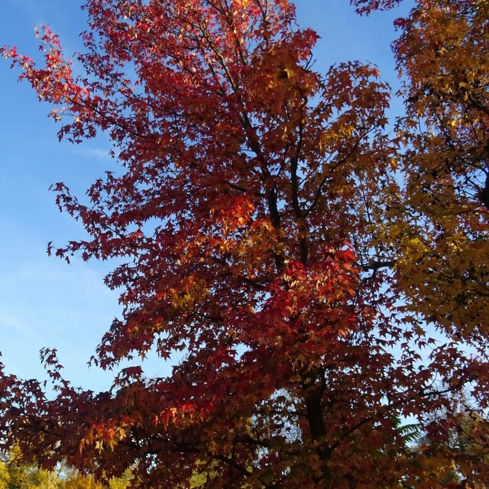 le liquidanbar ou copalme d’amérique est une espèce d’arbre originaire d’amérique ou il pousse près des chênes et des peupliers. Cet arbre est souvent implanté pour son joli feuillage caduc, prenant une jolie teinte rouge, orange et verte à l’automne..