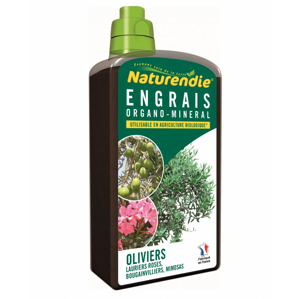 cet engrais pour oliviers, lauriers roses, mimosa et bougainvilliers naturendie est utilisable en agriculture biologique. Il est équilibré avec des phyto-stimulants naturels, il contient des ingrédients riches en matière organique, en acides aminés libres (5%) et magnésium. Cet engrais naturendie respecte l’environnement et favorise une meilleure croissance et une meilleure fructification de vos oliviers, bougainvilliers, lauriers roses, mimosas…