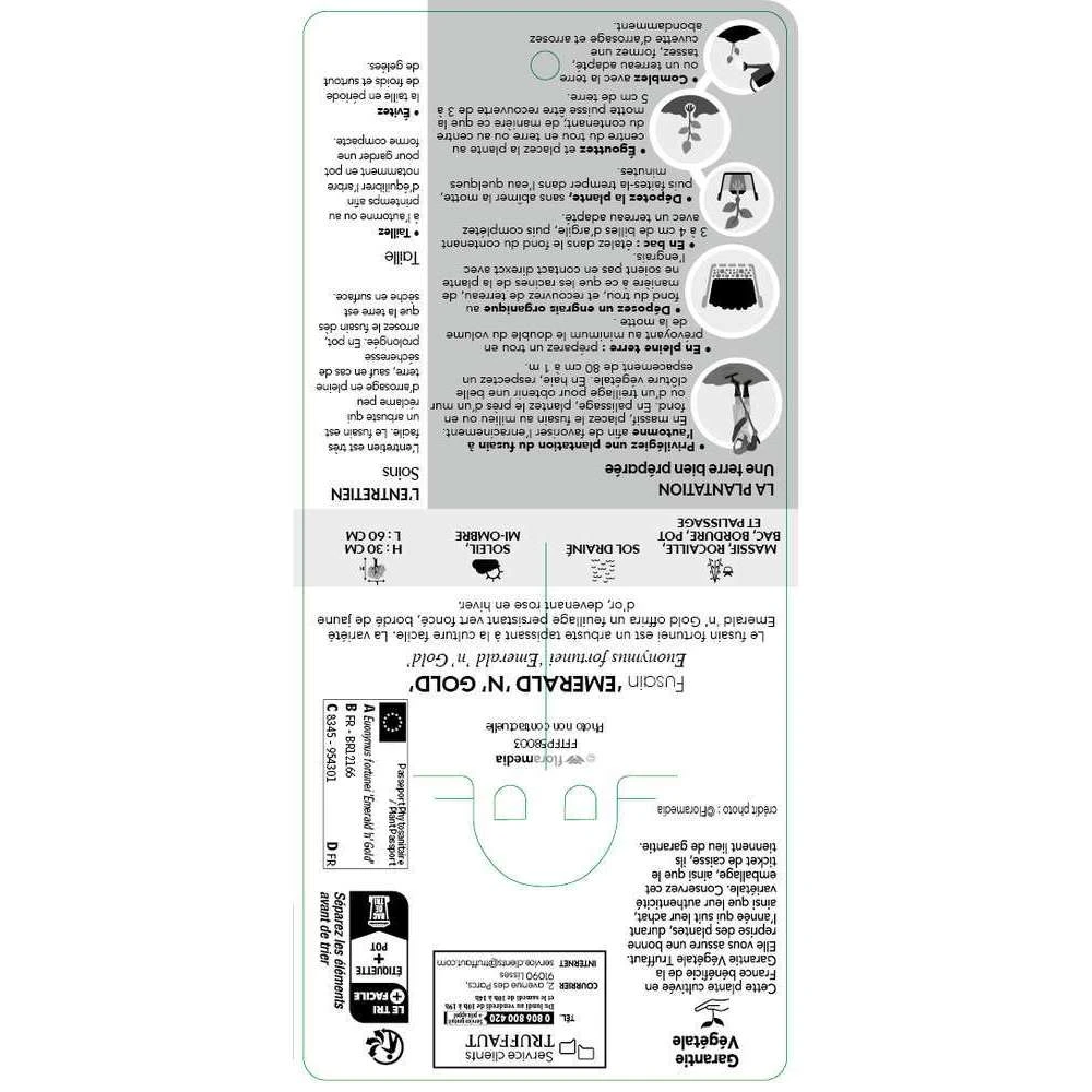 Le genre Euonymus (Fusain) comprend environ 170 espèces, originaires d’Amérique du Nord, d’Europe, d’Asie, d’Afrique et d’Australie. Euonymus fortunei est une espèce originaire de Chine, introduite en Europe en 1907. ‘ Emerald’n Gold ‘ est une variété horticole. Cet arbuste, à la végétation dense et tapissante avec des rameaux érigés, atteint 30 cm de hauteur pour une largeur de 60 cm. Feuillage persistant, vert foncé bleuté, marginé de jaune d’or, et ponctué de tâches rouges à l’automne. Prend une teinte rosée en hiver. Feuilles ovales de 2 à 4 cm de diamètre. Longs rameaux qu’il est possible de palisser contre un mur. Pousse dans un sol normal, sec, même calcaire. Exposition au soleil ou à mi-ombre. Rustique, jusqu’à – 20°C. Taille d’équilibre en fin d’hiver. On le plante en isolé dans une rocaille, en groupe sur talus, en bordure. Excellent en bac.