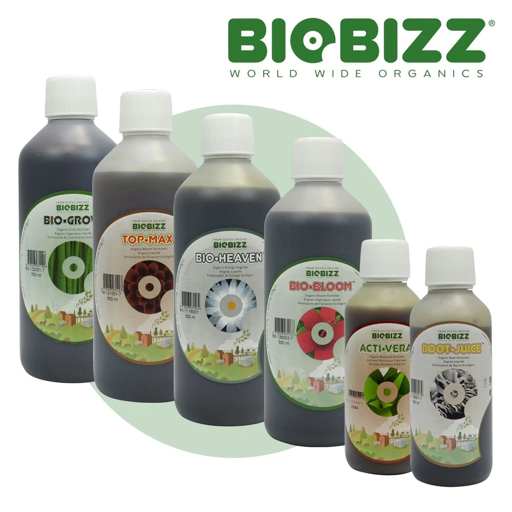 pack d’engrais organique en bouteille de 500ml biobizz pour la culture terre. Ce programme de fertilisation contient les engrais croissance et floraison, les stimulants racinaire et de floraison ainsi que des activateurs de vitalité.