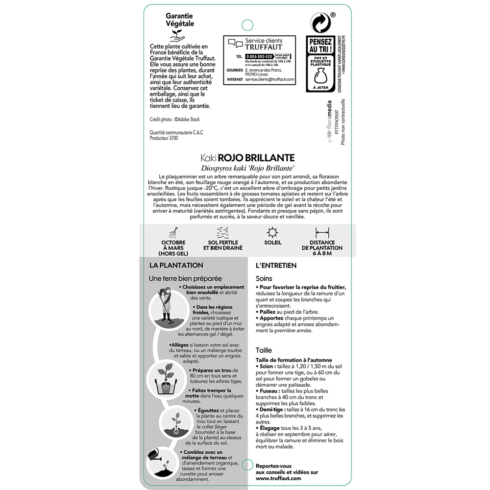 Le genre Diospyros comprend environ 450 espèces originaires des rĂ©gions chaudes dont principalement l’IndonĂ©sie. Diospyros kaki (Plaqueminier ou Kaki) est l’une de ces espèces, originaire de Chine. Ce petit arbre, Ă cime compacte arrondie, atteint 7 m de hauteur pour une largeur de 4 m. Feuillage caduc, vert foncĂ©, brillant dessus, plus clair et mat dessous. Belles colorations en automne, orange et pourpre. Floraison blanc jaunâtre en mai-juin. Fruits globuleux, ressemblants Ă une tomate, jaune Ă rouge orangĂ© brillant, en octobre-novembre. A planter dans un sol profond et fertile, en situation ensoleillĂ©e et chaude, bien abritĂ©e dans les rĂ©gions Ă hivers rigoureux. Ne nĂ©cessite aucune taille. Le Kaki « rouge billant » est un grand plaqueminier très productif, aux gros fruits lĂ©gèrement aplatis, jaunes virant au rouge Ă maturitĂ©. Pulpe jaune orangĂ© Ă grande qualitĂ© gustative. Astringent, il se consomme blet en dĂ©cembre. Rustique Ă -20°C.