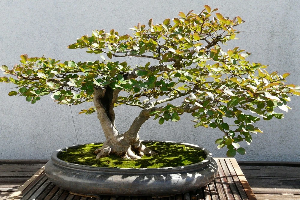 joli bonsaĂŻ de serre froide avec des petites feuilles et de belles fleurs
