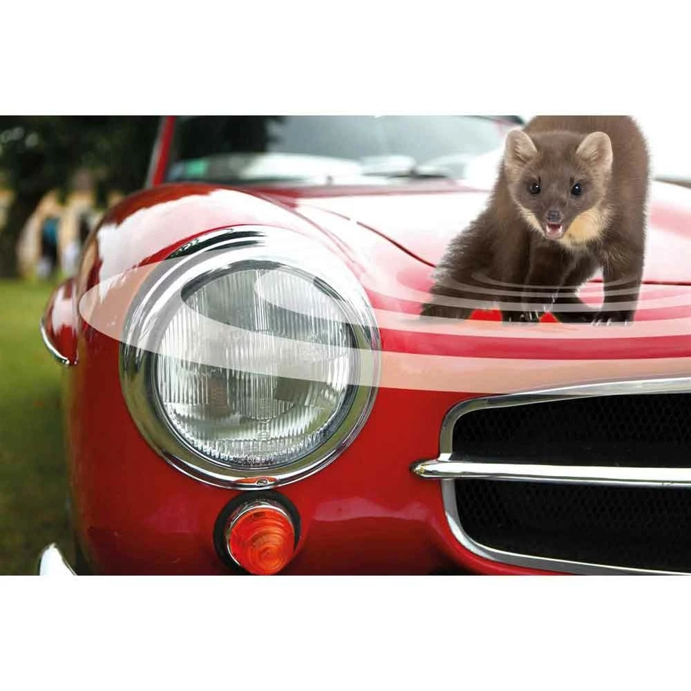 Installé dans le compartiment moteur d’un véhicule, ce système éloignera les mustélidés du véhicule en utilisant une combinaison d’ultrasons agressifs et de décharges électriques à haute tension. Un haut-parleur intégré au boîtier de commande émet des pulsations d’ultrasons en série, dont la fréquence est constamment modulée entre 23 et 27 khz. Huit plaques d’acier inoxydable fixées aux composants du compartiment moteur susceptibles d’être attaqués (conduites, tubes, tuyaux, fils et câbles électriques), soumises à une tension de 250 volts par le boîtier de commande. Inaudible par les être humains. Sans danger pour les animaux.