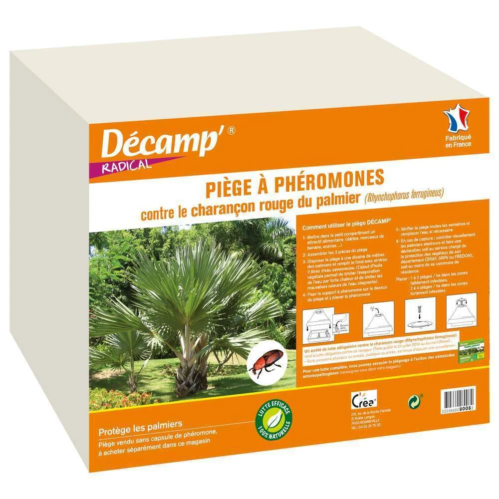Optez pour ce piège contre le charançon du palmier qui vous aidera à protéger votre palmier contre le charançon rouge, rhynchophorus ferrugineus, responsable du dessèchement et la mort du végétal. La femelle du Charançon rouge pond dans les tissus du palmier. À l’éclosion, les larves se nourrissent des tissus sains et frais. Du fait des nombreuses galeries creusées, le palmier est fragilisé et peut se rompre sous l’action du vent. Ce piège contre le charançon du palmier contribuera à lutter contre ce phénomène.